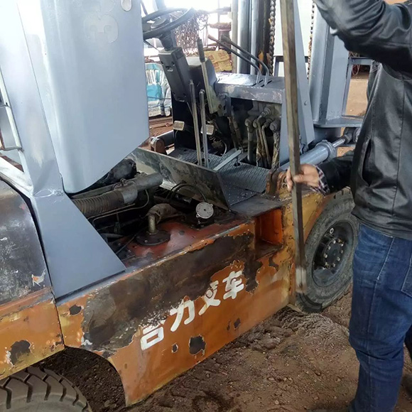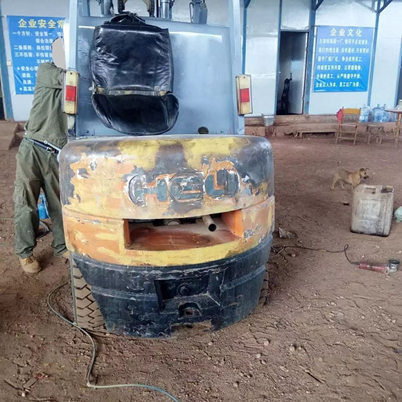 這臺(tái)翻新的叉車,可以肯定的說(shuō)是假冒偽劣叉車,從圖中我們可以看到配重打磨過(guò)的痕跡,黑乎乎的,似乎已經(jīng)準(zhǔn)備完工。