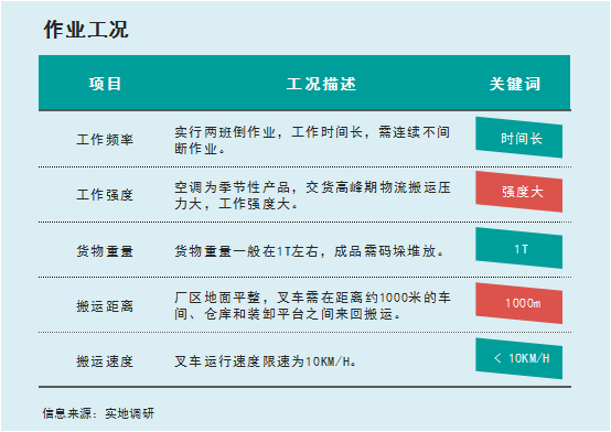 第三,廠區(qū)地面平整,叉車(chē)需在距離約1000米的車(chē)間、倉(cāng)庫(kù)和裝卸平臺(tái)之間來(lái)回搬運(yùn);