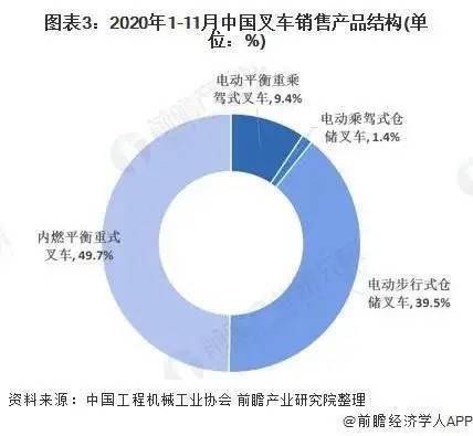 叉車主要分為四類,包括內(nèi)燃平衡重式叉車、電動(dòng)平衡重叉車、電動(dòng)乘駕式倉(cāng)儲(chǔ)叉車、電動(dòng)步行式倉(cāng)儲(chǔ)叉車,分別對(duì)應(yīng)歐美分類標(biāo)準(zhǔn)的IV/V、I、II、III類叉車。從2020年1-11月份的銷售結(jié)構(gòu)來(lái)看,內(nèi)燃平衡重式叉車和電動(dòng)步行式倉(cāng)儲(chǔ)叉車占比最高,分別為49.7%和39.5%。