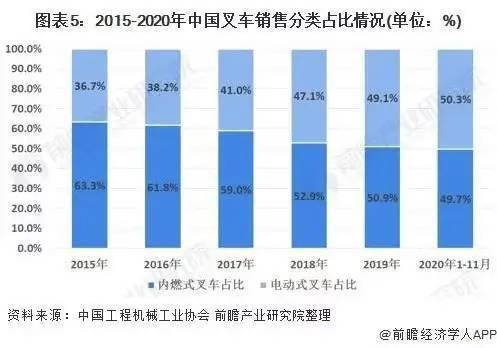 從2015-2020年中國(guó)叉車銷售分類占比情況來(lái)看,電動(dòng)式叉車的銷量占比逐年提升,從2015年的36.7%提升至2020年1-11月份的50.3%。主要是受到環(huán)保政策及室內(nèi)作業(yè)環(huán)境要求的驅(qū)動(dòng)作用,電動(dòng)叉車需求持續(xù)增長(zhǎng)。另外,根據(jù)中國(guó)工程機(jī)械工業(yè)協(xié)會(huì)資料顯示,在發(fā)達(dá)國(guó)家的叉車銷售結(jié)構(gòu)中電動(dòng)叉車占比均超60%,未來(lái)我國(guó)電動(dòng)叉車比例將持續(xù)提升。